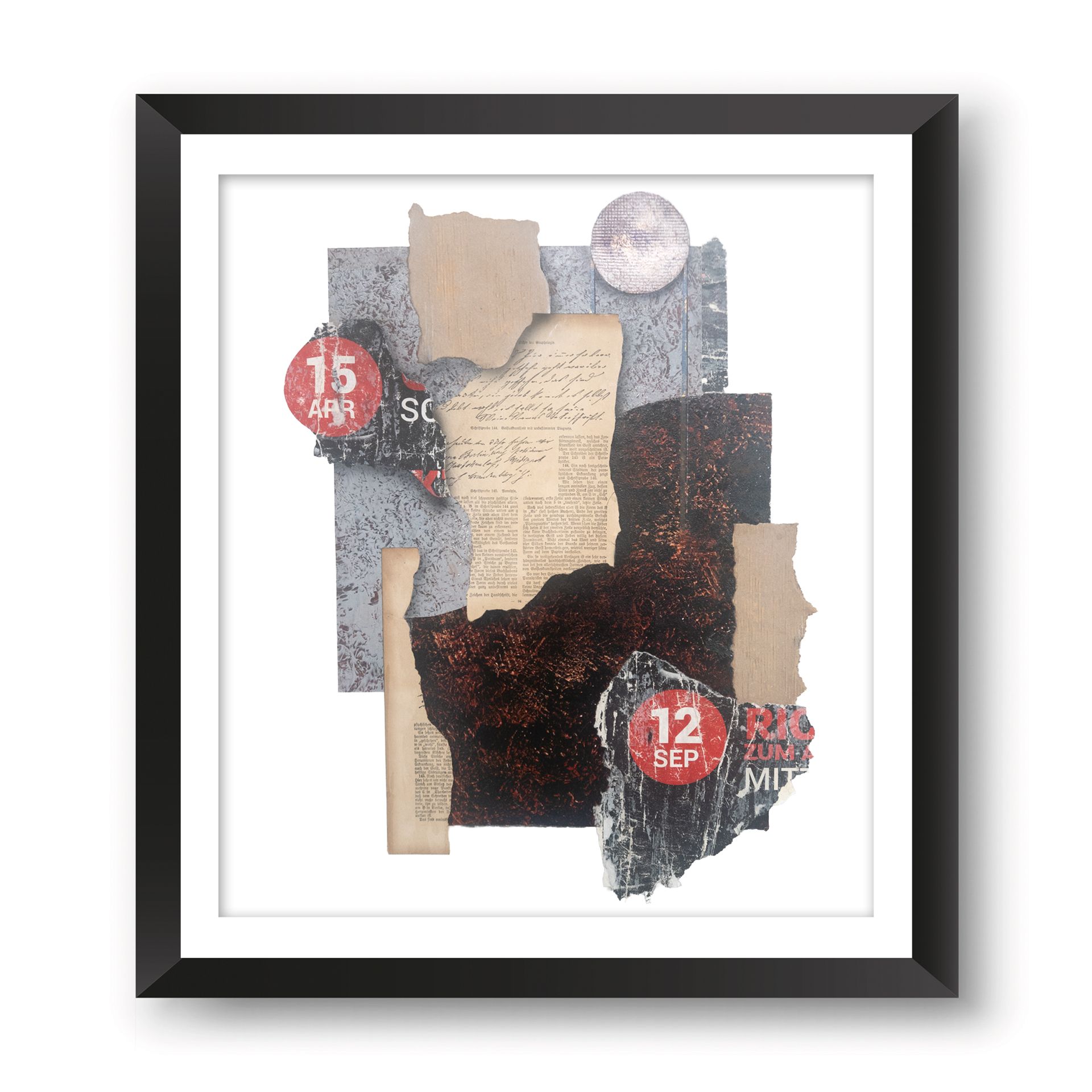 Klar definierte, oft geometrische Elemente bilden das Grundgerüst für den Bildaufbau. Diese Strukturen wirken wie ein Netz, das den Blick des Betrachters lenkt, und ihm Orientierung gibt. Durch die partielle Verwendung des Strukturdrucks treten unter anderem abstrahierte Linienmuster und geometrische Formen in einen Dialog mit der Farbe. Diese setzt gezielt Kontraste, akzentuiert bestimmte Bereiche und erzeugt so dynamische Spannungen im Gesamtbild. Der Einsatz von Farbtönen und Plakatabrissen – sei es in intensiver Plastizität oder in gedämpften Nuancen – verstärkt die emotionale Wirkung der Komposition.